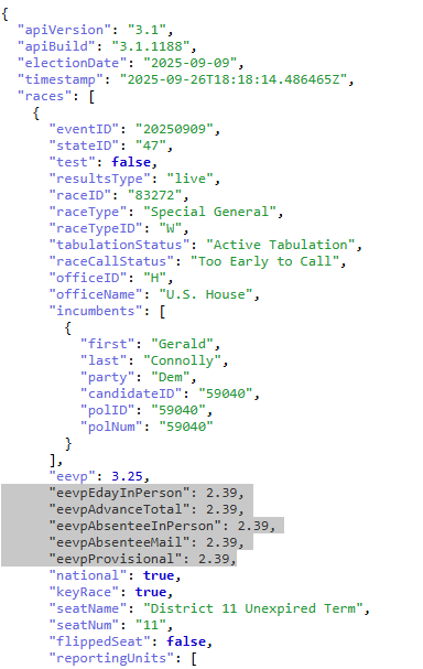 Elections API now returns EEVP (Estimated Expected Vote Percentage) for all vote types available in a given election. The vote type EEVP values are available at the race level.