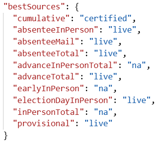 Starting Feb. 12, 2026, you will receive a blend of certified cumulative data and live vote type data when you specify resultsType=b and votetypes=true in the request. The response also includes new fields to indicate the source (certified or live) for cumulative results and each vote type if applicable; for example: