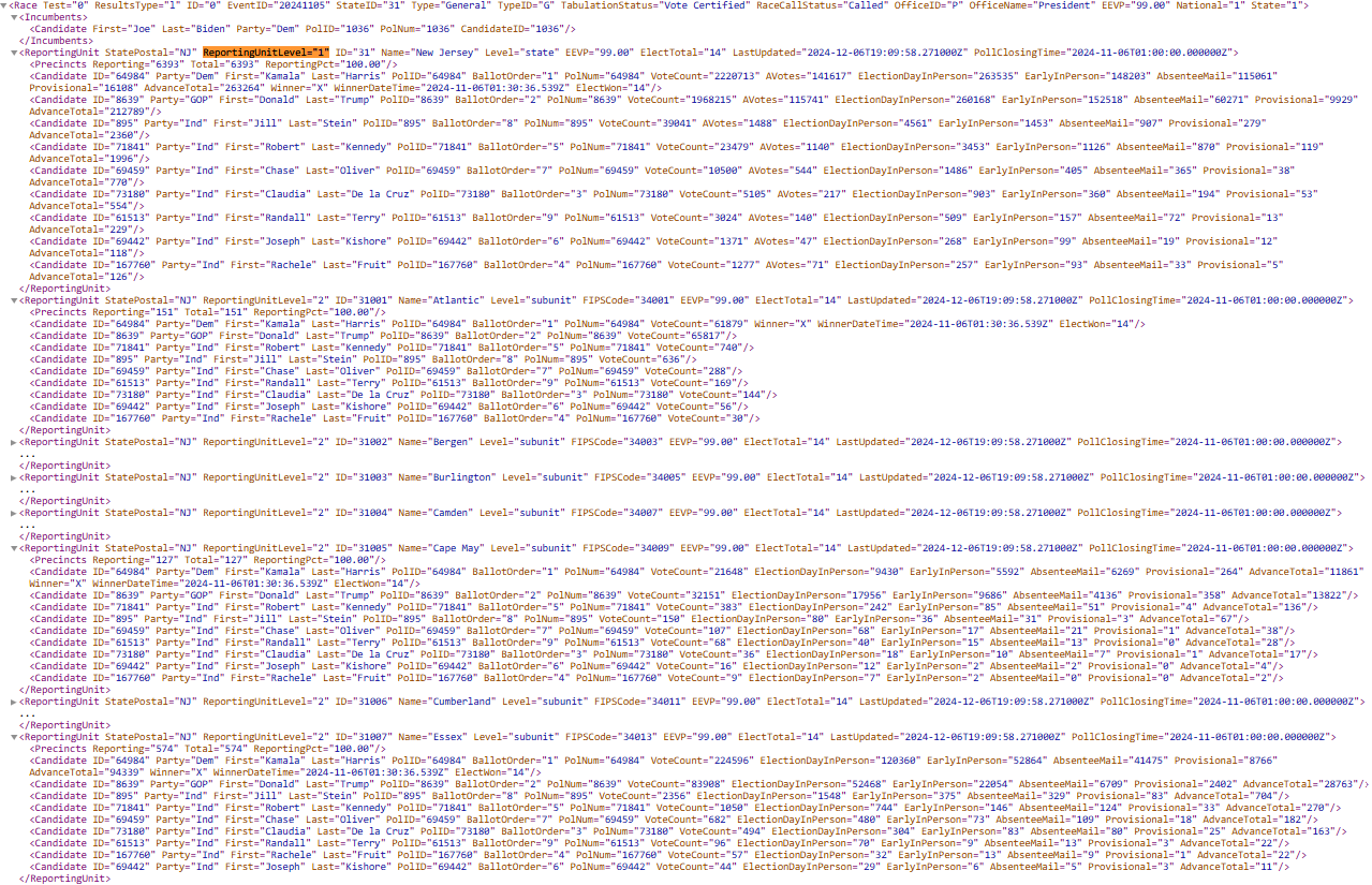 In this example, vote type totals are returned in the state-level reporting unit (ReportingUnitLevel="1" Name="New Jersey") although vote type results may not be available in some RUs like Atlantic and are available in others like Cape May and Essex.