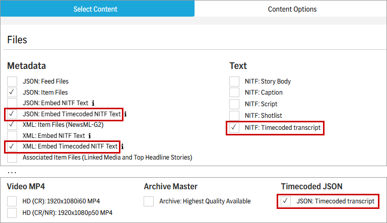 JSON: Embed Timecoded NITF Text. In conjunction with JSON: Item Files, embeds timecoded NITF transcripts in the JSON item files.